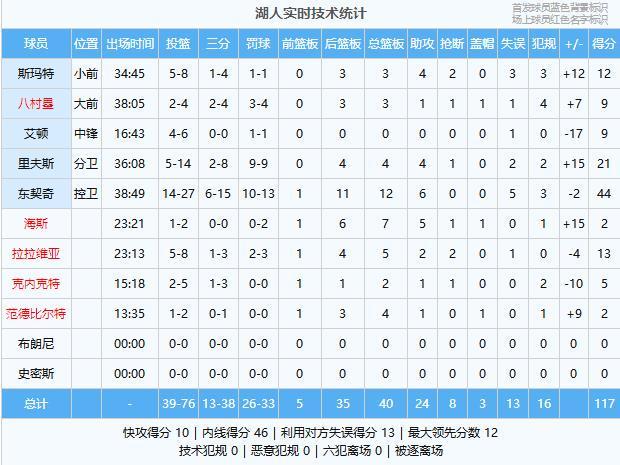东契奇44分12板6助、里夫斯21分4板4助、拉拉维亚13分5板2助2断、斯玛特12分3板4助2断、八村塁9分3板1助、艾顿9分、克内克特5分2板1助、海斯2分7板5助、范德比尔特2分4板1助