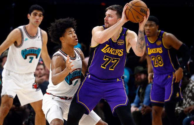 下半场,湖人连续造杀伤,东契奇三分再进湖人一波18-5攻击波追上比分,随后双方比分交替领先,三节湖人追到差2分,末节湖人7-0反超回,艾顿回到替补席,八村塁和东契奇三分再进领先双位数,随后灰熊追分湖人总能回应保持住10分左右领先,最终湖人逆转灰熊。