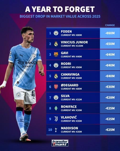 北京时间10月25日,德转统计出了2025年身价跌幅最高的10名球员,福登的身价从1.4亿欧元跌至8000万欧元,跌幅达到了6000万欧元,为所有球员最高,维尼修斯身价从2亿欧元跌至1.5亿欧元,下跌5000万欧元排名第二。