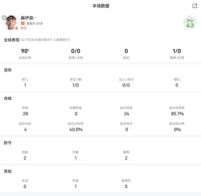 赫伊森国家德比全场数据:2抢断2解围,传球成功率85.7%